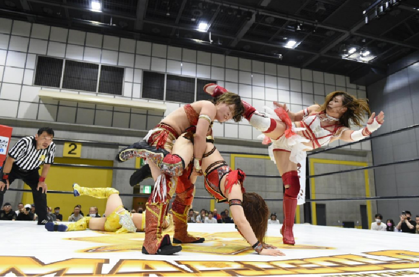 Aono follows up with a body slam and tags in Shozuki. Shozuki hits a series of knee lifts and a reverse crab hold. He throws her into the ropes, but Yuzuki counters with a drop kick and a swan dive face crusher. She tags in Utami.